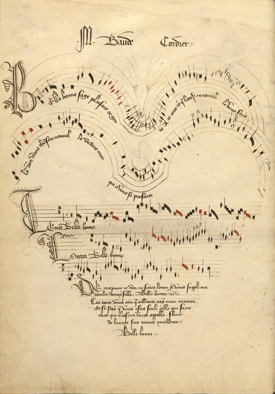 On the left, a video demonstrating a cantograph in the shape of a vinyl record. On the right, Belle, Bonne, Sage, by Baude Cordier.