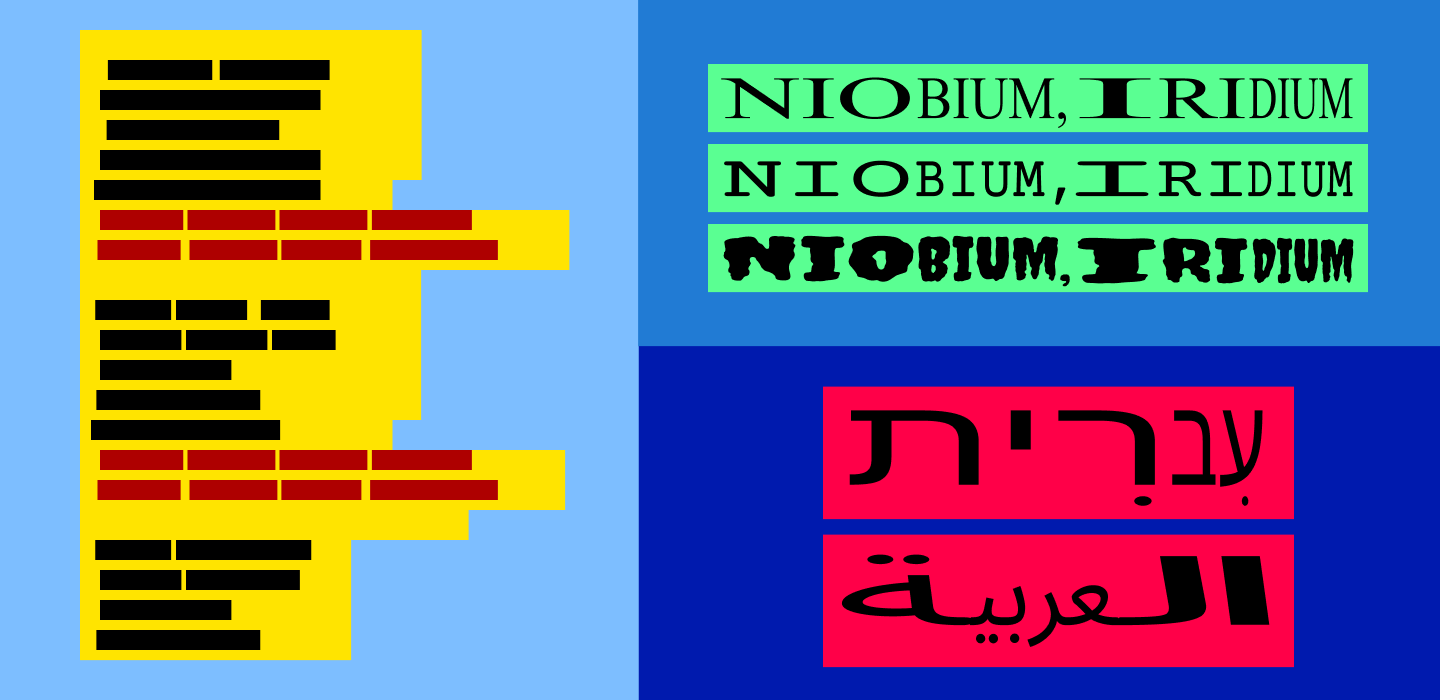 On the left, a cantograph with differently shaped sections which allows for multiple tempos. Top-right, a sample of different fonts. Bottom-right, the words "Hebrew" (עִברִית) and "Arabic" (العربية) in their respective scripts, notable for being read right-to-left, with some syllables elongated.