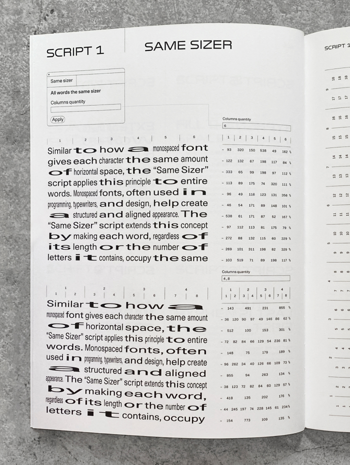 First I came across the Alternative Layout System by Giliane Cachin and INT studio, which explores different ways to handle typographical problems like hyphenation in latin script.[2] I was particularly inspired by “Same Sizer” and “Ext. Word & Letter”. For example, “Same Sizer” puts each word into a grid, and stretches the word to fit within each grid cell.