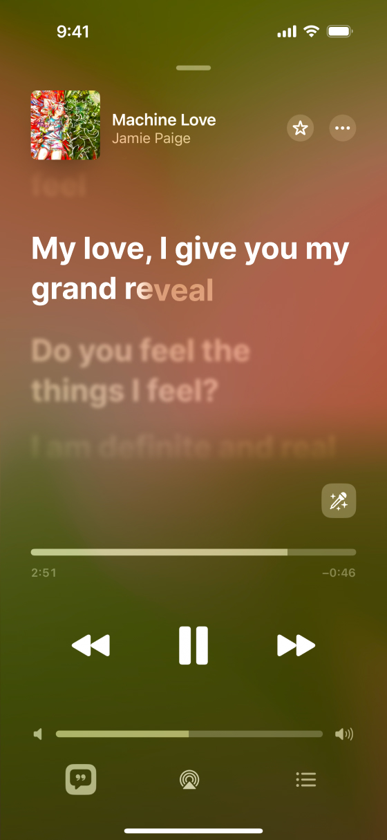 Apple Music on iPhone, showing timed-text lyrics for the song Machine Love by Jamie Paige.[3] The text lights up in sync with the song, like in this example with the word "reveal", which the singer takes 3 seconds to sing.