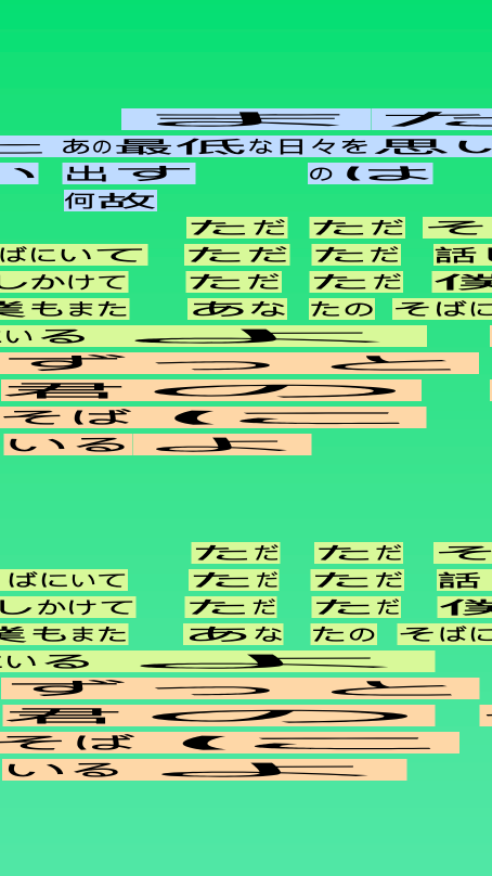 With this song, I represented background vocals as lines underneath the primary text. The text in Japanese I coloured differently to make it stand out.