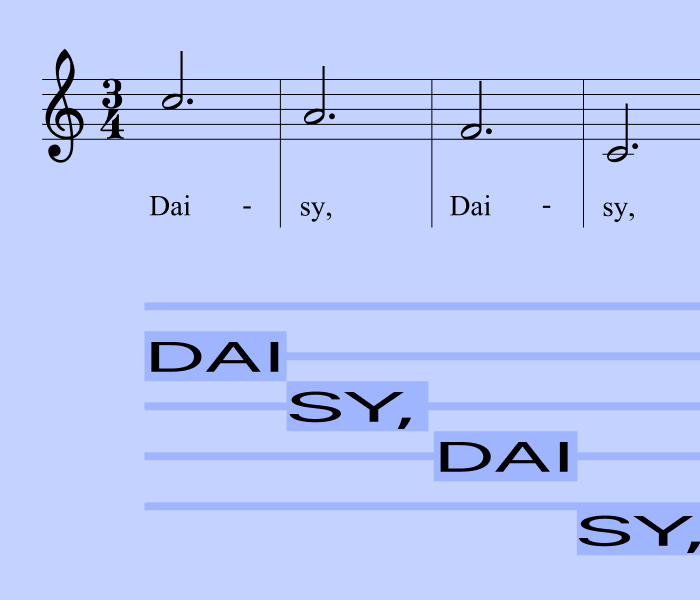 The lines of text could also be visualised in some other form. In the video above on the left, I tried displaying the lyrics to the song Daisy Bell in a shape of a vinyl record. On the right, is an example of “Eye Music” from the 15th century by Baude Cordier which depicts a heart-shaped staff. Musicologist Jordan Alexander Key created an animation of it being sung.