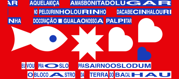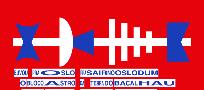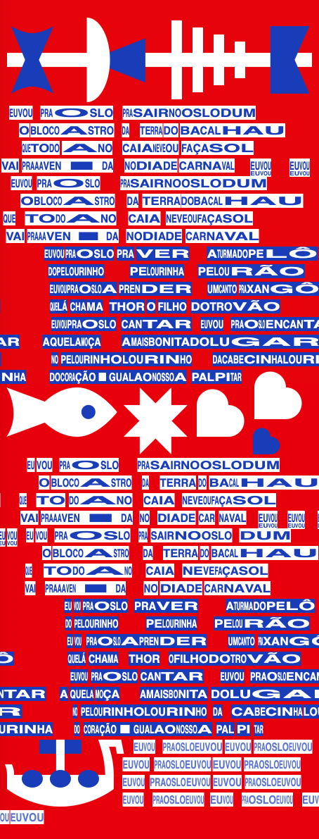 The visualisations don’t have to just be text. An artist could embed illustrations within the visualisation. I’ve tried this already with Gilberto Gil’s song Oslodum, which is about Gil visiting the city Oslo, Norway. Paying homage to another Afro-Brazilian artist that I like, Rubem Valentim, I used Valentim’s imagery of the Yoruba deity Xangô (Whom Gil likens to the Norse god Thor in the song), along with some Scandinavian imagery of a cod (which Gil mentions in the song), a star (selburose), and a viking ship. I tried to make the overall imagery match Valentim’s geometric shapes, which happens to play well with the design of the cantograph’s rectangular text blocks.[7]